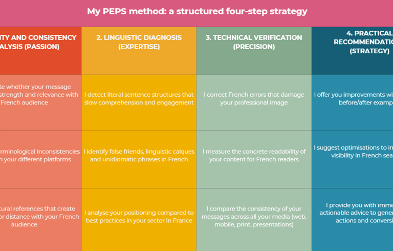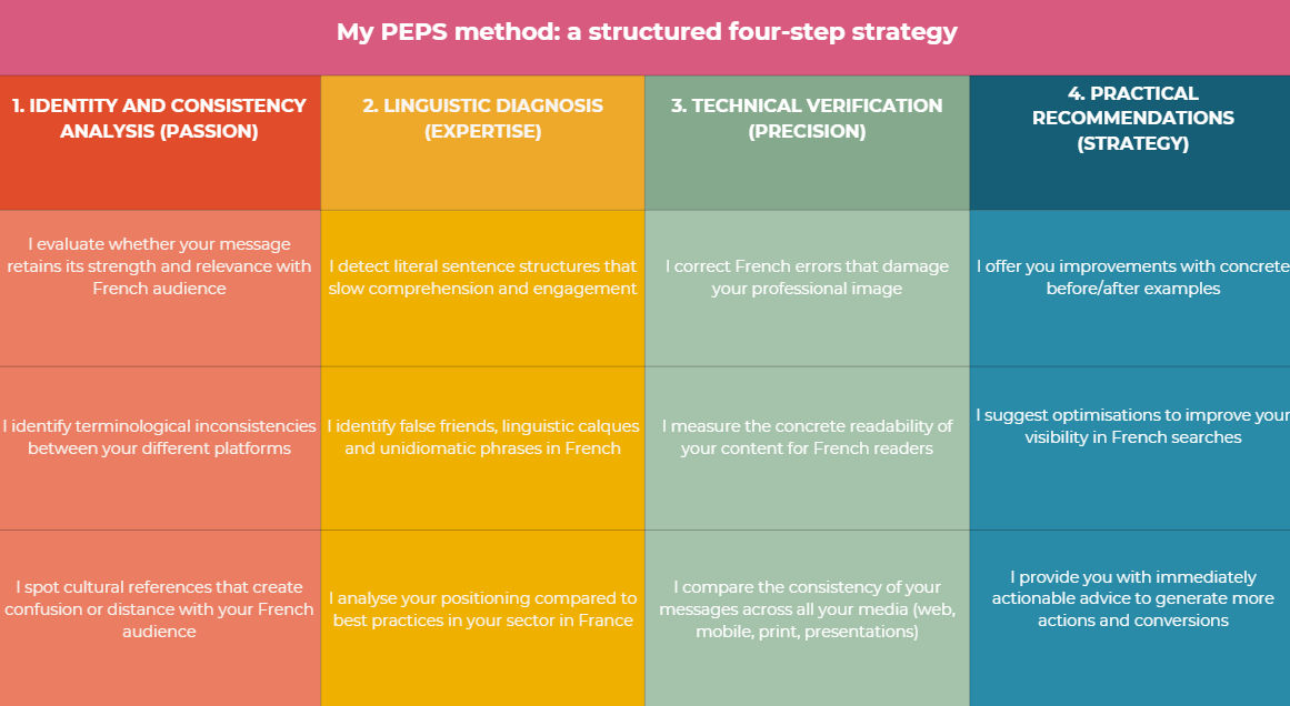 A message that is technically correct but culturally unsuited to France can be damaging, leading to a reduction in engagement, a drop in conversions and a weaker brand image. The PEPS linguistic audit accurately identifies these invisible barriers and turns them into growth drivers.
